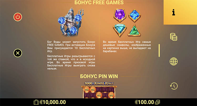 - Free Games (Посейдон) — 10 бесплатных вращений с высокооплачиваемыми символами. Во время активации фриспинов можно выиграть дополнительный бонус.