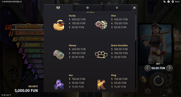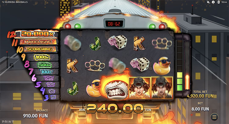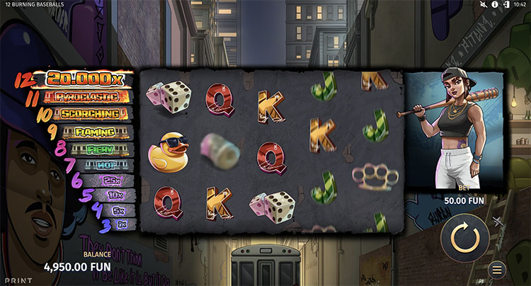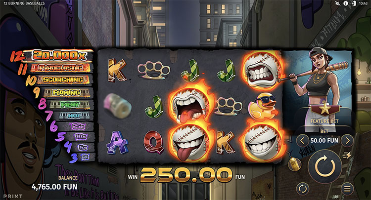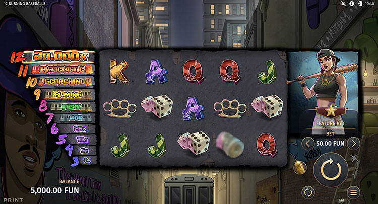 Игровой автомат разработан совместно с Print Studios. Он посвящен уличной жизни: действие разворачивается на фоне мрачного города, в котором бейсбольная бита нужна не только в спортивной игре. В слоте 12 Burning Baseballs предусмотрены 3 бонусных режима и накопительная система очков, открывающая новые скины персонажей и дополнительные предметы.