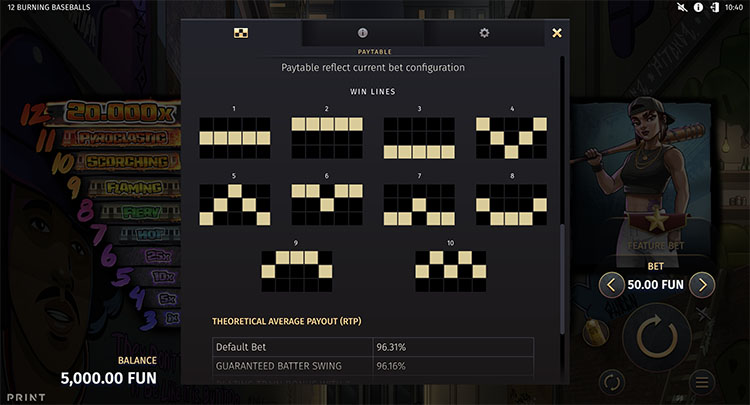 Это 5-барабанный автомат с 10 фиксированными линиями. Комбинации формируются слева направо и состоят минимум из 3 символов. Бейсбольные мячи — это оплачиваемые скаттеры, которые начисляют выигрыши независимо от расположения на линиях. Таблица коэффициентов находится рядом с барабанами.