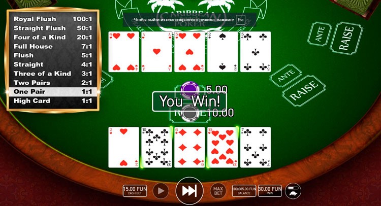 Для вступления в игру делается ставка Ante. Пользователь и крупье получают по пять карт. Игрок может обменять любое их количество или сбросить руку, выбрав Fold. Можно сразу согласиться на борьбу против дилера — поставить фишки в поле Raise. При выборе Fold анте проигрывает. Если ставится подтверждение Raise, руки вскрываются.