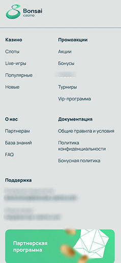 Также на главной странице пользователь увидит предложение пройти «Путь завоевателя» — так называется программа лояльности. За новые статусы игрокам обещаны эксклюзивные призы и различные бонусы. Кроме того, на главной странице оператор описал «Путь соратника». Это реферальная программа. За привлечение новых клиентов, которые будут играть в Bonsai Casino на реальные деньги в игровых автоматах, пользователю обещано финансовое вознаграждение.