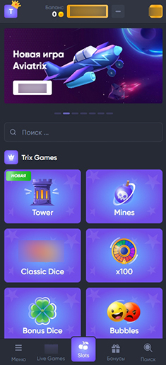 Отдельно представлена страница Trix Games. Это эксклюзивные игры, доступные лишь в данном казино. В их числе: Tower, Dice, Mines, Popit, Mega Wheel, Bubbles и другие. Деморежим для них не предусмотрен — они доступны только для реальных ставок.
