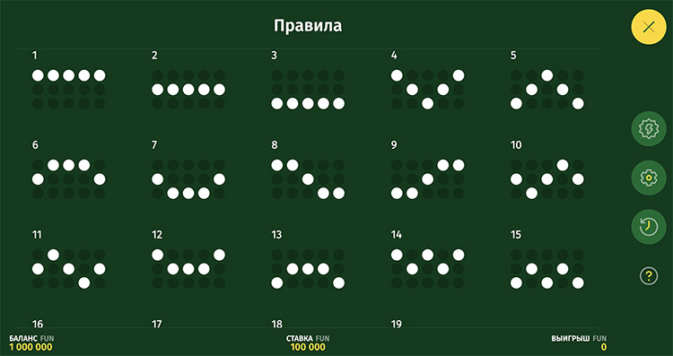 У игрового автомата 5 барабанов и 19 фиксированных линий. Комбинации состоят минимум из 3 одинаковых символов и начинаются с левого края поля. Также встречаются: