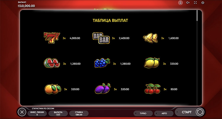 У игрового автомата 3 барабана с 3 рядами. Провайдер использует классическую символику — фрукты, колокольчики, BAR. Также на барабанах встречаются:
