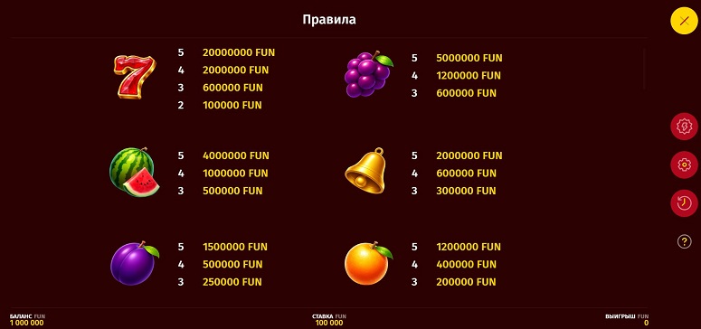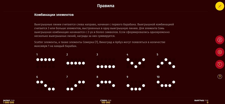 Провайдер выбрал 5-барабанное игровое поле на 3 ряда. Комбинации состоят минимум из 3 обычных символов или 2 семерок. Также встречаются: