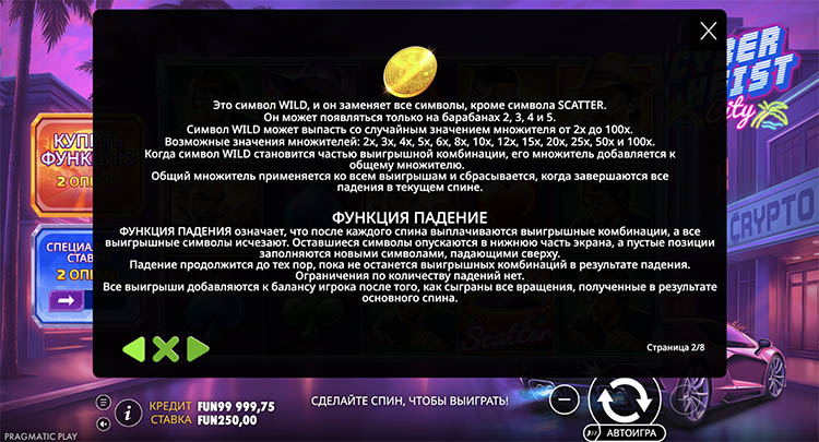 - Вайлды — выпадают со 2-го барабана, участвуют в чужих комбинациях и несут множители до х100, которые применяются к общему выигрышу.