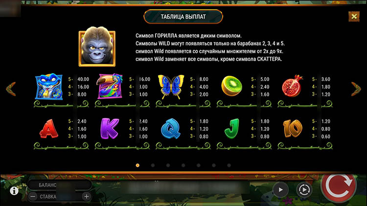 Это 5-барабанный игровой автомат с фиксированными линиями выплат. Комбинации состоят минимум из 3 символов. Изображение гориллы — это вайлд. Он имеет такие особенности: