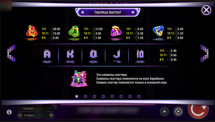 При появлении скаттеров пользователь получает до 16 бесплатных вращений. Только в бонусе встречается розовый диско-шар, который дает дополнительные спины и активирует множитель барабана. Мультипликаторы разных столбцов суммируются, если расположенные на них символы участвуют в выигрышной комбинации. Еще одна особенность бонуса — золотая пластинка, которая добавляет к множителю барабана от х2 до х50.