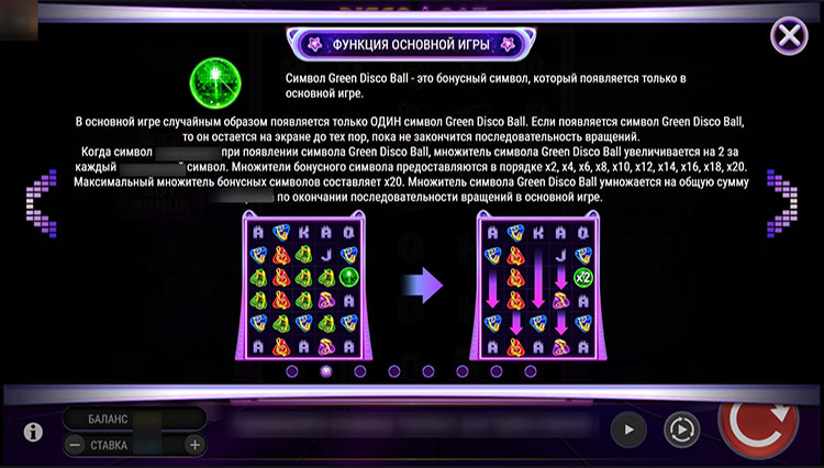 - Зеленый диско-шар — это множитель, который растет на х2 с каждым новым выигрышем. Его значение достигает х20. Мультипликатор применяется к сумме всех выплат, полученных во время вращения.