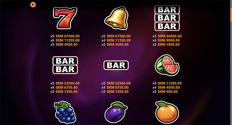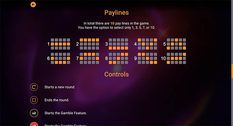 Пользователи могут активировать 1, 3, 5, 7 или 10 линий. Комбинации формируются слева направо и состоят минимум из 2 одинаковых символов. На поле встречаются:
