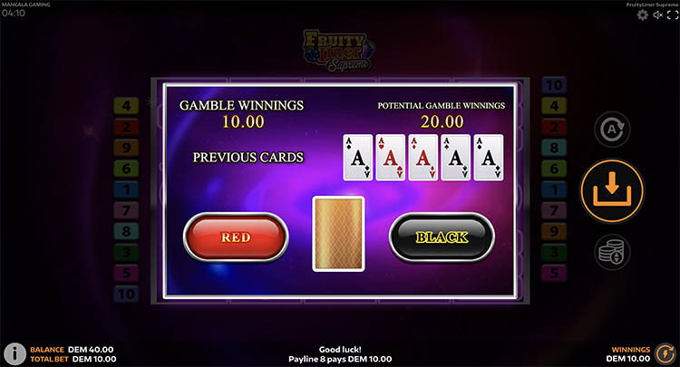 Спецсимволы выпадают в любых позициях и формируют оплачиваемые комбинации. После каждого выигрышного вращения можно перейти в риск-игру с выбором карты. Если пользователь правильно угадывает цвет, начисляется выплата в 2-кратном объеме. В общей сложности можно сделать до 5 попыток. В случае неудачи деньги сгорают.