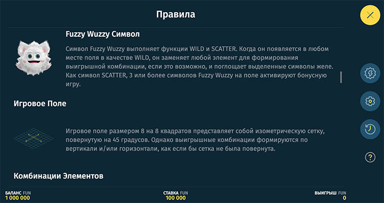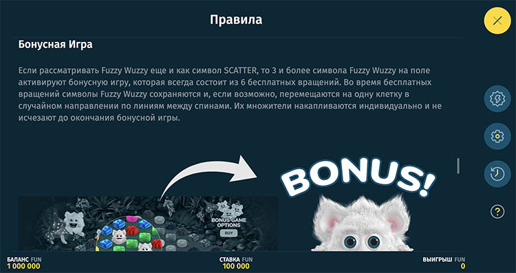 Слот вышел в марте 2023 года. Он переносит игроков в волшебный лес, в котором живут необычные пушистые существа вуззи. Они питаются мармеладом и могут увеличивать выплаты. Для бесплатной игры на странице добавлена демоверсия слота Fuzzy Wuzzy. Также редакция подготовила описание функций и характеристик.