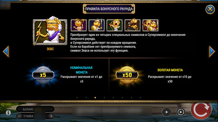 - На барабанах выпадают изображения монет и символы богов, которые наделены особыми функциями. Например, картинка с Герой разблокирует до 3 барабанов, с Афиной — собирает видимые номиналы, с Эросом — добавляет свое значение ко всем изображениям монет. Символ Гефеста несет множитель до х5. Картинка с Зевсом улучшает символы богов и сохраняет их до конца действия бонуса.