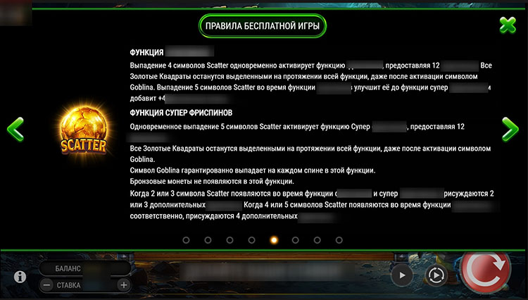 Комбинация из 4 скаттеров запускает 12 фриспинов. Они сохраняют механики и функции базового режима. Улучшенный бонус активируется при выпадении 5 скаттеров. Игроку начисляются 16 вращений, во время которых все золотые квадраты становятся липкими, картинка с гоблином появляется при каждом спине, не используются символы бронзовых монет с минимальными номиналами. Провайдер предусмотрел несколько покупных бонусов. Они запускаются в любой момент, если на балансе достаточно средств.