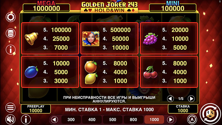 | Джокер | 10 000 | 50 000 | 500 000 | |