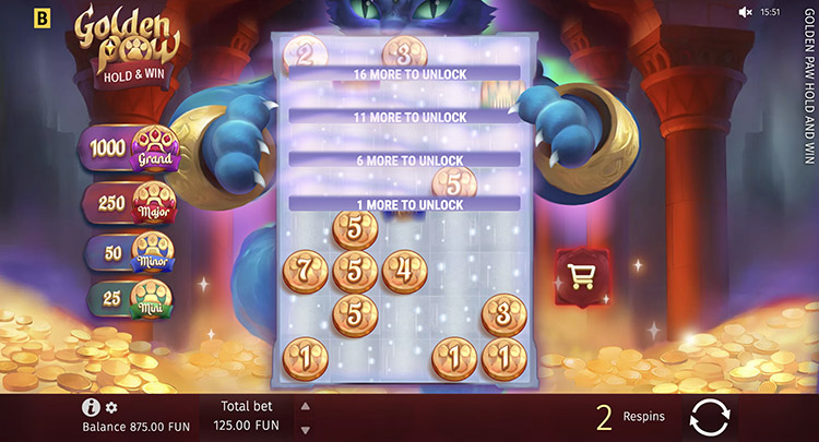 Когда на поле выпадают 6 и более монет, запускается бонус с механикой Hold and Win. На старте дают 3 вращения, которые продлеваются при появлении новых символов. Активная область поля постепенно расширяется. Это происходит, когда выпадает нужное количество монет. В бонусном раунде разыгрываются джекпоты. Mini составляет х25, Minor — х50, Major — х250, Grand — х1000.