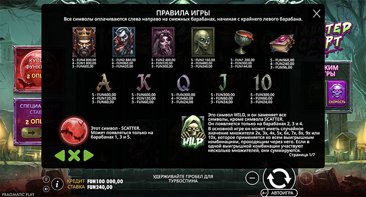 На трех средних барабанах может появиться вайлд с множителем от х2 до х10. Если комбинация сформирована с участием нескольких диких символов, их мультипликаторы суммируются. Выпадение трех скаттеров активирует фриспины. Есть два типа бесплатных прокруток: