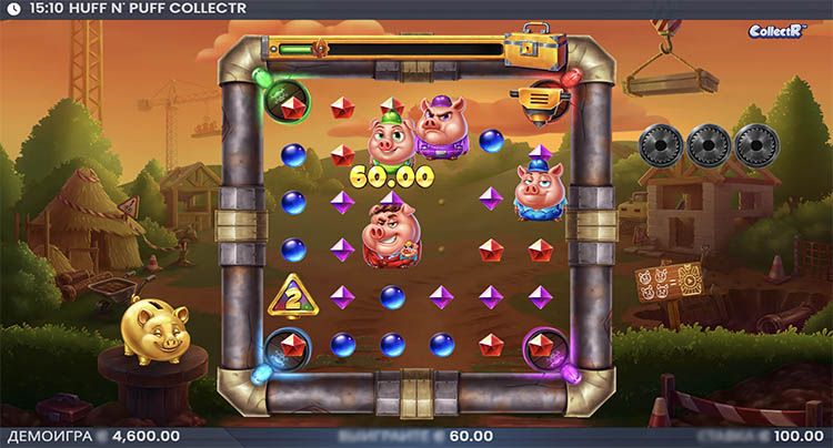 Вместо изображений золотых поросят используются символы касок, которые оставляют за собой рамки ячеек. В конце бонусного раунда в отмеченных клетках появятся изображения соломенных, деревянных или каменных домов. Их сдувает волк, открывая случайные денежные символы. Возможные значения — от х0,25 до х2500.