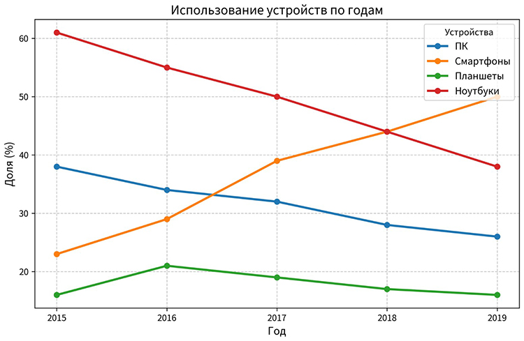 Операторы переключились на стратегию Mobile First. Интерфейс сайтов стали делать адаптивным, начали разрабатывать приложения для Android и iOS. Доля пользователей других устройств за этот период существенно уменьшилась. Больше всего это коснулось трафика с ноутбуков — произошло снижение с 61% в 2015-м до 38% в 2019-м.