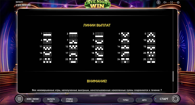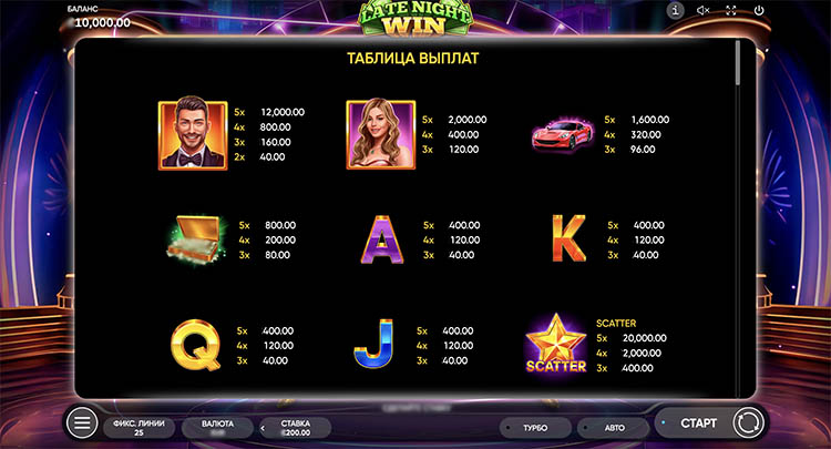 Слот создает атмосферу игрового шоу в наземном казино. Пользователей ждут гламурные ведущие, неоновые огни, чемоданы денег и роскошные автомобили. На странице доступна демоверсия слота Late Night Win для бесплатного запуска.