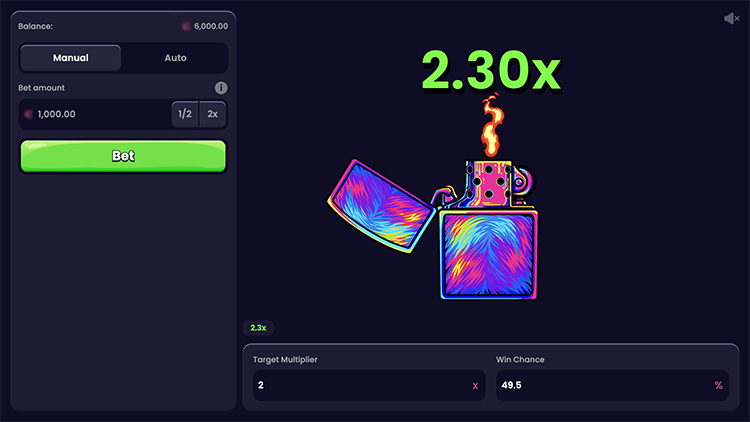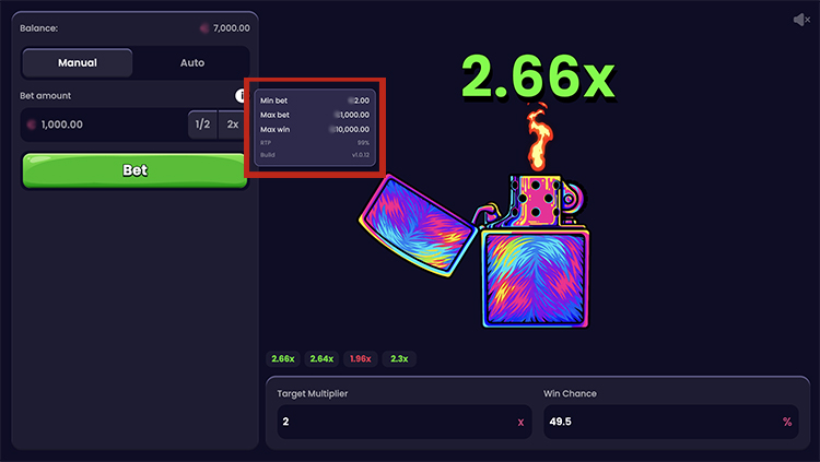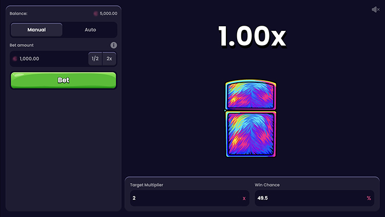Пользователь указывает размер множителя и начинает игру. На экране появляется случайное значение, которое может быть выше, ниже или совпадать с указанным коэффициентом. Есть несколько особенностей: