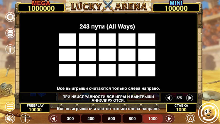 - При заполнении всех клеток начисляется мегаджекпот в размере х1000.