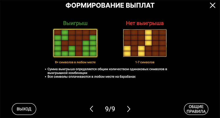 Игровой автомат основан на механике Pay Anywhere. Выплаты начисляются при выпадении 8 и более одинаковых символов. Также задействовано несколько механик: