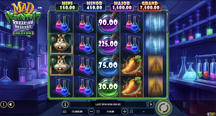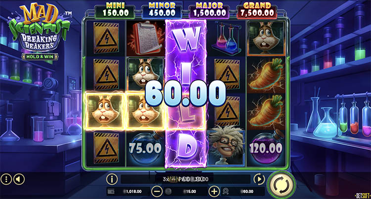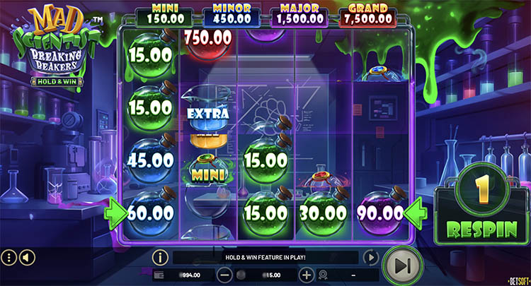 Бонус начинается с 3 респинов. Вращения продлеваются при выпадении обычных колб или спецсимволов. В бонусе разыгрываются фиксированные джекпоты: Mini равен x10, Minor — x30, Major — x100, Grand — x500. Символ All собирает все значения, выпавшие на поле. Extra — увеличивает коэффициенты. Cross суммирует номиналы колб, которые находятся по горизонтали и вертикали.