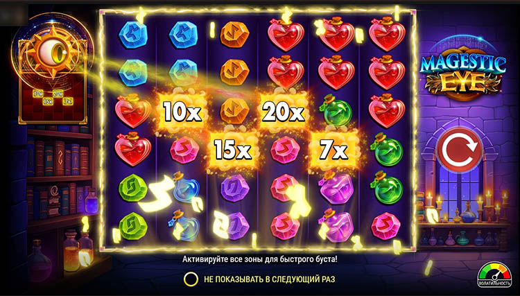 - Eye Area. Рядом с барабанами находится пустая сетка поля. При каждом вращении до 3 клеток могут попасть в «область глаза». Если в отмеченной ячейке окажется выигрышный символ, она получит повышенный множитель — х2. Он растет с каждой новым кластером, выпавшим в указанной зоне. Коэффициент каждой ячейки может достигать х30. Если выигрышная комбинация включает в себя несколько мультипликаторов, они перемножаются.