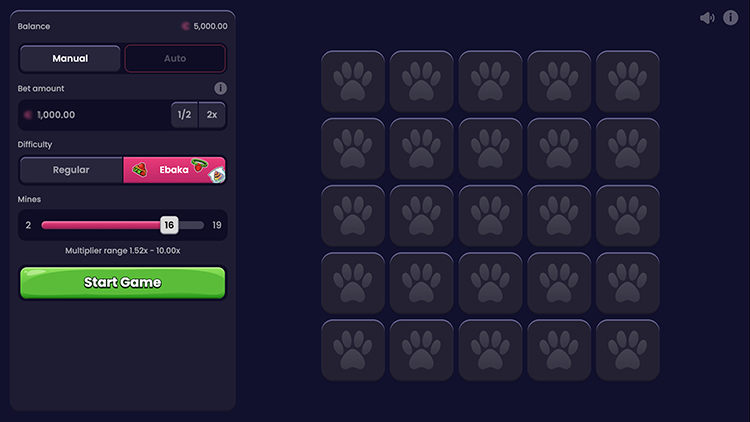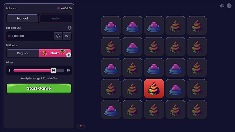 На панели управления находится ползунок для регулирования уровня риска. При смещении вправо увеличиваются потенциальные выплаты, а вместе с ними и количество спрятанных мин. Пользователям доступен ручной и автоматический режимы игры. Слот поставляется с несколькими значениями RTP — 96%, 97%, 98% и 99%. Уровень отдачи устанавливается по усмотрению онлайн-казино.