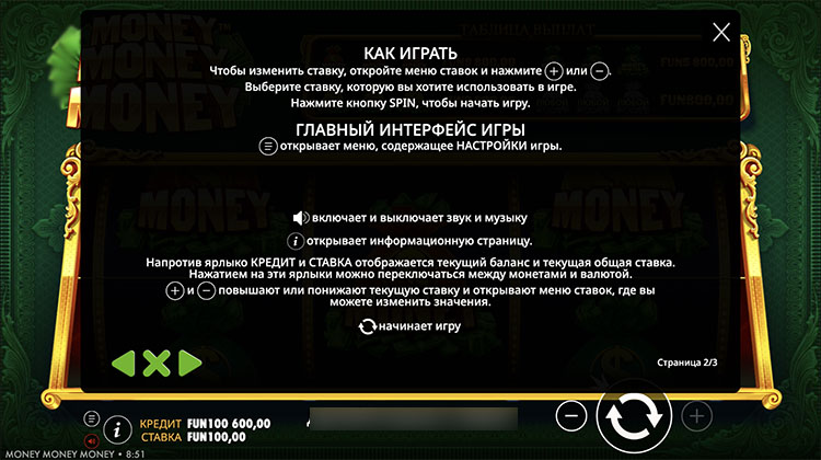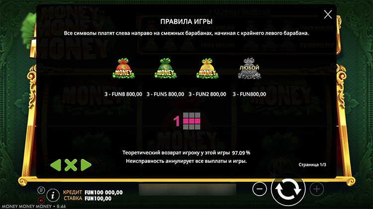 Разработчик использует одинаковые символы денежных мешков. Они отличаются лишь цветом. От этого зависит размер выигрыша. Для удобства пользователей таблица с коэффициентами находится прямо над барабанами.