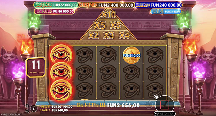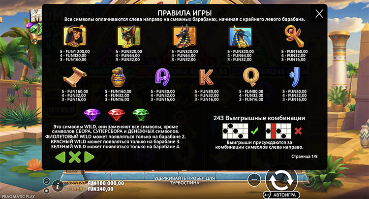 У игрового автомата классическое поле формата 5 х 3 и 243 активные линии. Комбинации формируются минимум из 3 одинаковых символов. Отдельного внимания заслуживают вайлды. Они не только заменяют другие символы, но и пополняют прогрессивные счетчики над барабанами. Когда над камнями поднимается фигура Фараона, может сработать бонус: