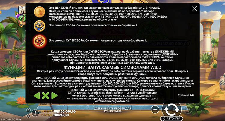 - Upgrade (фиолетовые вайлды) — вращение колеса Фортуны с улучшенными отдельными секторами.