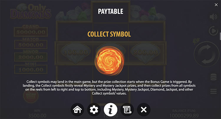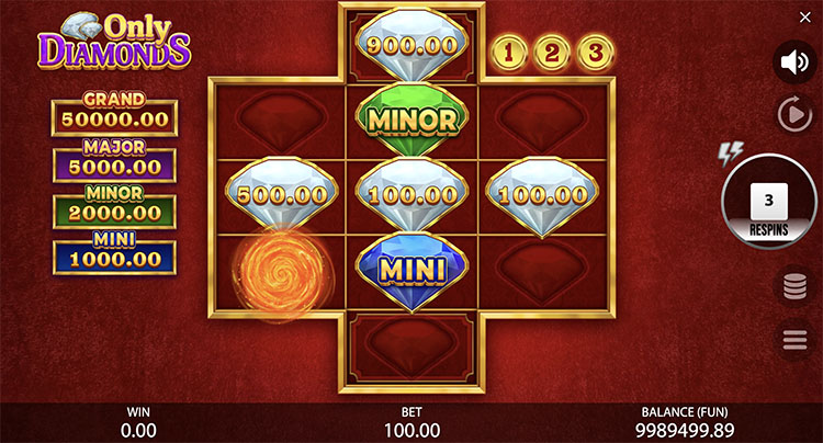 Бонус начинается с 3 респинов. Счетчик перезапускается каждый раз при выпадении нового алмаза или другого спецсимвола. При заполнении всех клеток начисляется Grand-джекпот в размере х500.
