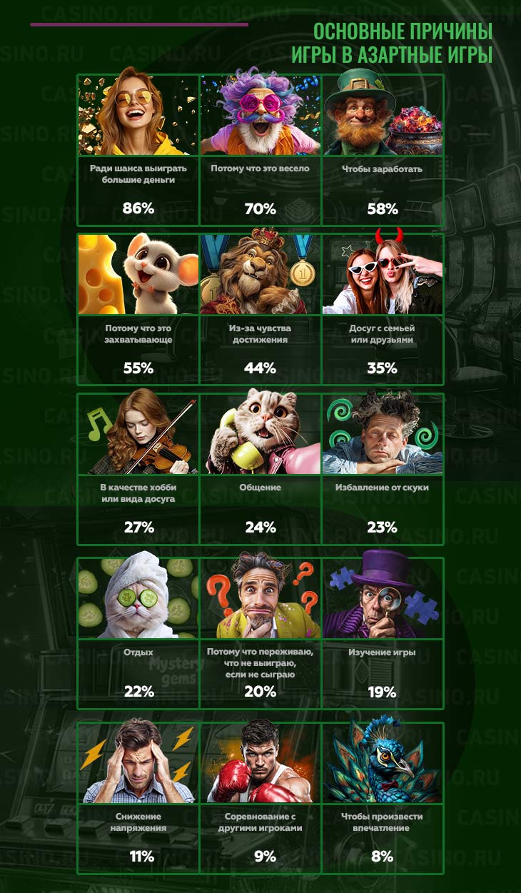 Комиссия по азартным играм Великобритании решила выяснить мотивы пользователей. По заказу регулятора Национальный центр социальных исследований совместно с Университетом Глазго провел опрос, в котором поучаствовали 5780 человек. Данные собирались с июля 2023-го по февраль 2024-го. Редакция Casino.ru подготовила наглядную инфографику по данным тематического отчета.