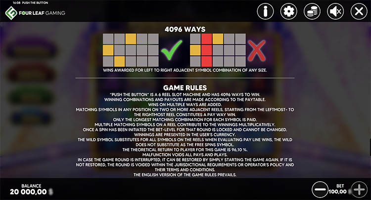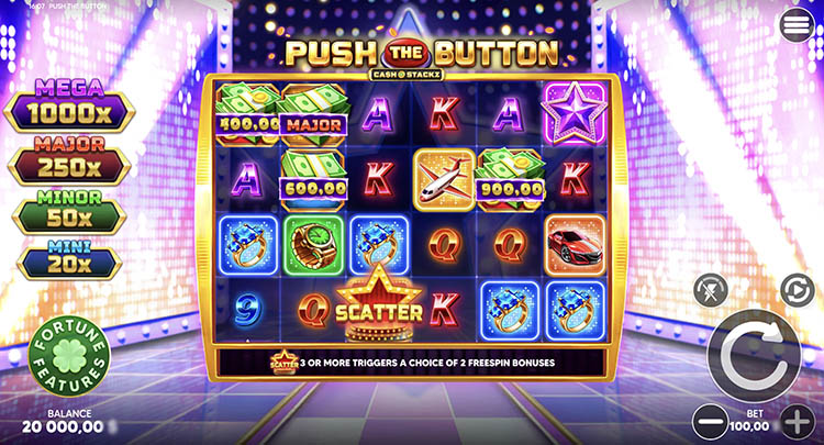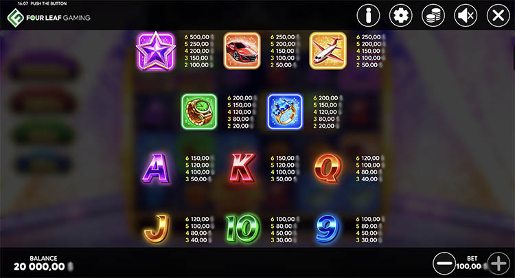 Слот стилизован под телешоу с розыгрышем денежных призов, дорогих украшений и автомобилей. В любой момент перед пользователями может появиться красная кнопка, нажатие на которую начисляет мгновенные выплаты, добавляет таинственные символы и не только. Официальная демоверсия слота Push The Button доступна на странице вместе с описанием встроенных опций и технических характеристик.