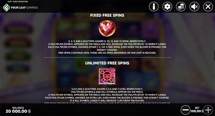 При выпадении 3 и более скаттеров запускается меню выбора бонуса. Фиксированные фриспины предусматривают от 8 до 15 вращений с возможностью продления. Безлимитный бонус начинается с 2-7 жизнями, которые отнимаются при выпадении черепа и пополняются при появлении символа-сердца. При запуске фриспинов активируется прогрессивный множитель, стартующий со значения х2. Он применяется к мгновенным выплатам и выигрышам за комбинации. Значение увеличивается на х1 при выпадении спецсимвола-множителя.