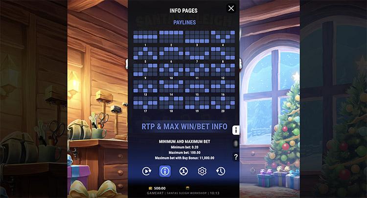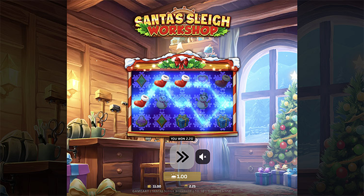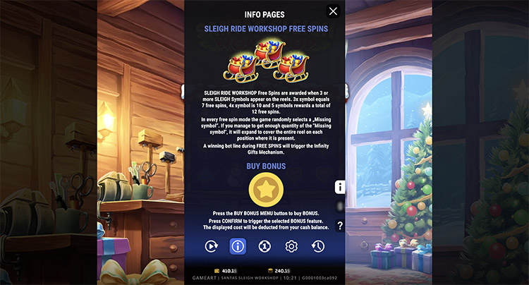 Sleigh Ride Workshop запускается при выпадении 3 саней и более. На старте можно получить от 7 до 12 вращений. В бонусе каждый скаттер дает дополнительный спин. Множители, как и в базовом режиме, сбрасываются. Перед каждым вращением случайный символ выбирается на роль расширяющегося. Функция срабатывает, если это способствует начислению выплаты.
