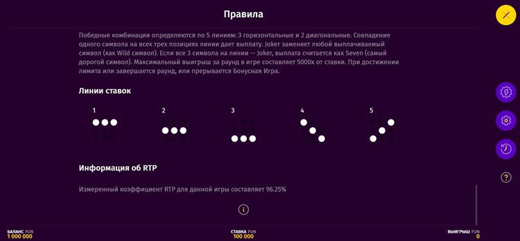 Символы выпадают на поле из трех барабанов и трех рядов. На них действуют пять оплачиваемых линий. Комбинации одинаковых символов формируются слева направо. В их составлении помогает вайлд.