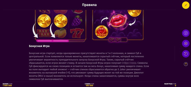В слоте есть еще два специальных символа. Первый — монеты. Они появляются на двух крайних барабанах со случайными множителями от х1 до х1000. Второй символ — губы. Он выпадает только на среднем барабане и собирает мультипликаторы. Если одновременно с ним по краям есть монеты, запускается бонусная игра Hold and Win: