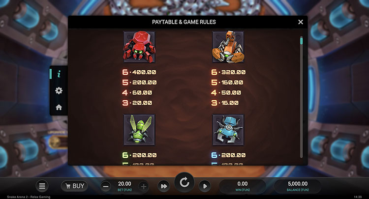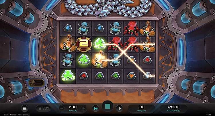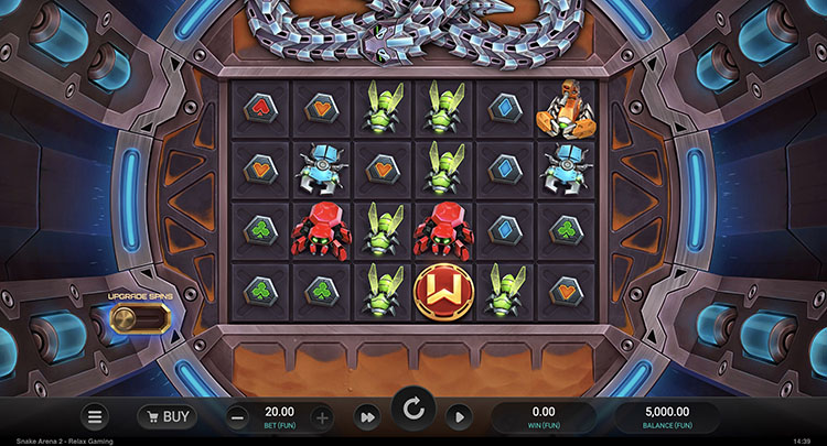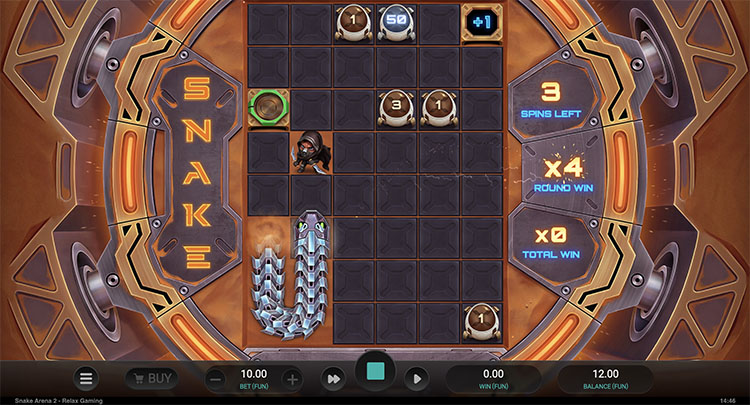 - Arena Spins. Это мини-игра с мгновенными выплатами и механикой аркад. На поле выпадают денежные и бонусные символы с функцией расширения, умножения и сбора. Они срабатывают, если оказываются на пути змеи, которая движется навстречу противнику. Коэффициенты суммируются между вращениями. Раунд завершится, когда змея укусит сама себя или будут использованы все вращения.