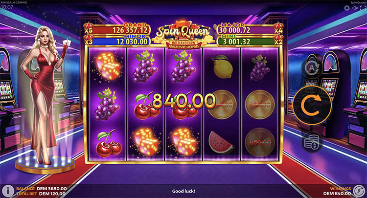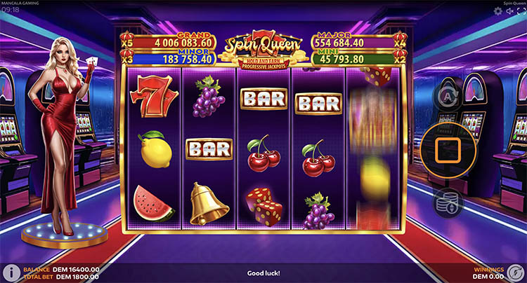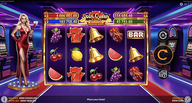 Автомат сочетает в себе традиции классических фруктовых слотов со зрелищностью современных игр. Пользователи оказываются посреди зала наземного казино, где их приветствует длинноволосая девушка. Она — Королева Вращений. Главная особенность игрового автомата — это прогрессивный джекпот. Он начисляется в бонусном раунде. Редакция Casino.ru подготовила подборный обзор функций и характеристик слота Spin Queen.