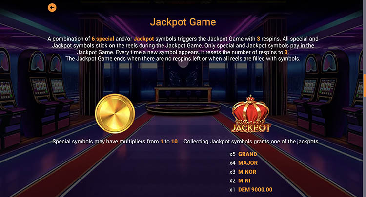 Одна корона оценивается в х5, две — начисляют Mini-джекпот, три — Minor, четыре — Major, пять — приносят максимальную Grand-выплату. Сумма потенциальных выигрышей растет в режиме реального времени. Текущий размер прогрессивных джекпотов отображается над барабанами. Максимальная выплата составляет х53 000.