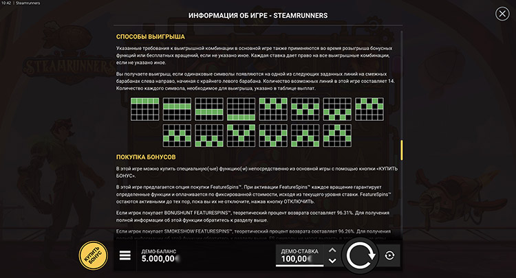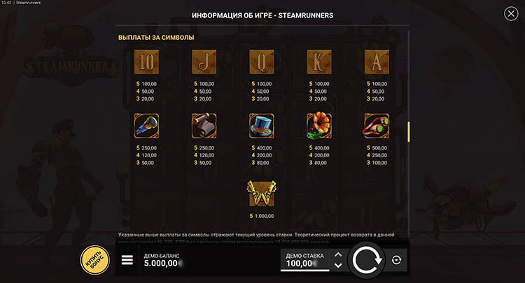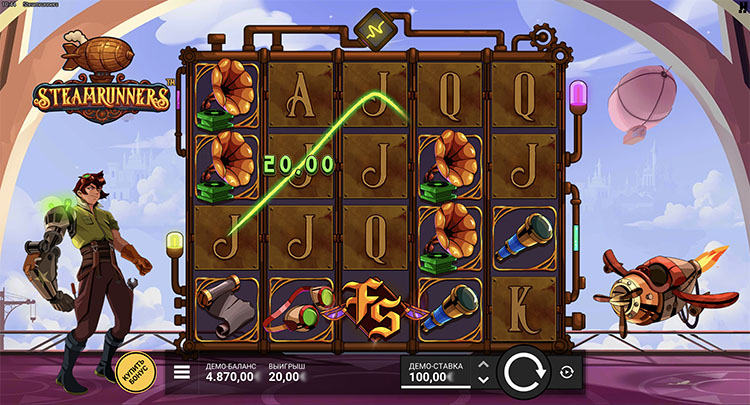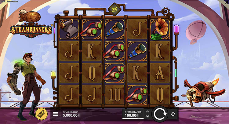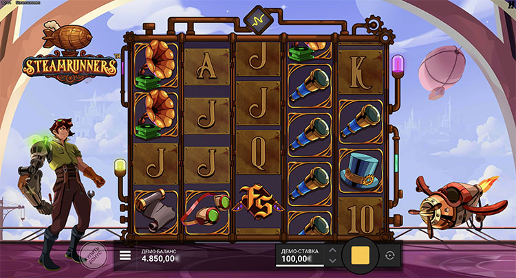Провайдер выпустил автомат в стиле стимпанка. Главный герой находится на борту дирижабля и готовится к полету. Оформление выдержано в мультипликационном стиле, а звуковое сопровождение усиливает приключенческую атмосферу. На странице представлена официальная демоверсия слота Steamrunners.