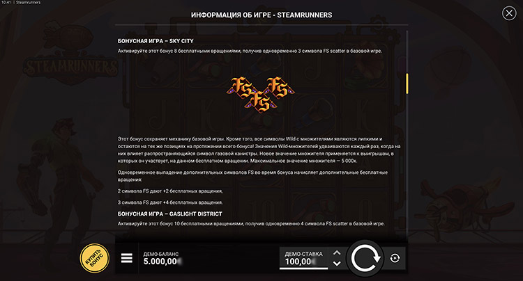 Провайдер добавил несколько режимов фриспинов. Sky City — это 8 вращений с липкими вайлдами-множителями. Gaslight District предусматривает 10 фриспинов с гарантированным диким символом при каждом вращении. Множители тоже остаются до конца раунда. Court of High Steam — это максимальный уровень бонуса, который запускается 5 скаттерами. В нем при каждом вращении выпадает случайная канистра.