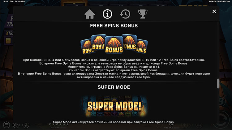 В автомате предусмотрены фриспины. Они запускаются комбинацией из 3-5 скаттеров. Пользователь получает 8-12 вращений с накопительным множителем, который не сбрасывается. Еще одна особенность:если при активации золотой маски не формируются выигрышные кластеры, вайлды переносятся на следующий спин.