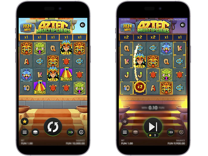 Aztec Multipliers привлекает внимание благодаря механике прогрессивных множителей. У каждого барабана есть свой мультипликатор, который увеличивается на х1, когда выигрышный символ оказывается внутри золотой рамки.