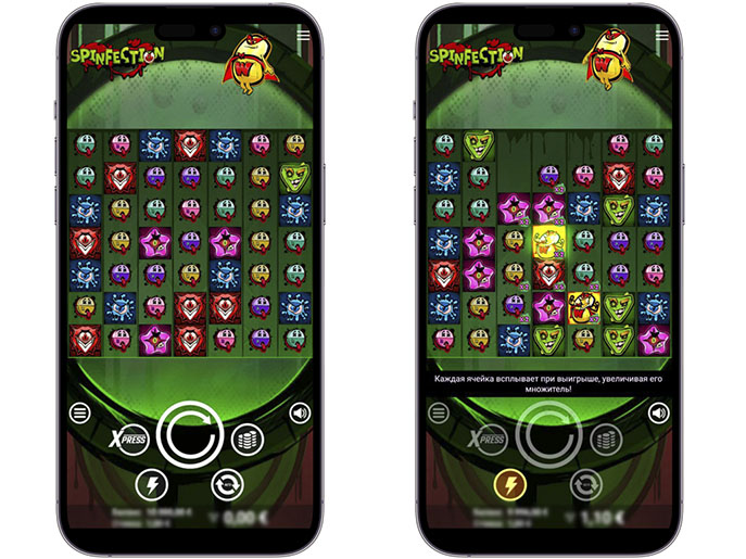 Spinfection знакомит игроков со злобными бактериями и вирусами. Пользователи могут заглянуть внутрь чашки Петри, которая находится на фоне квадратного игрового поля с 7 барабанами.