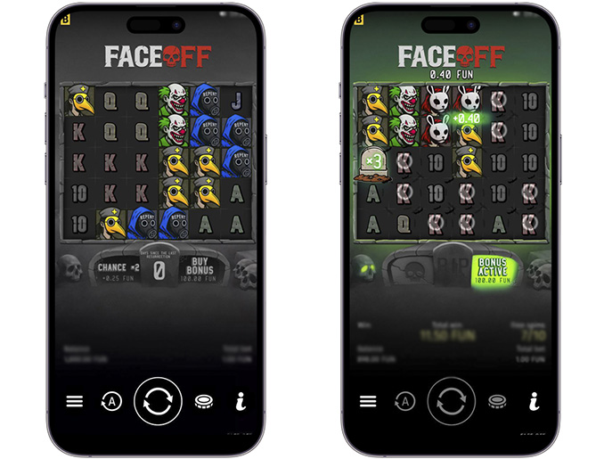 Face Off — еще один хэллоуинский слот в подборке. Он переносит игроков на жуткое кладбище с черепами и надгробными камнями. В его тени скрываются опасные маньяки, которых можно распознать по маскам.