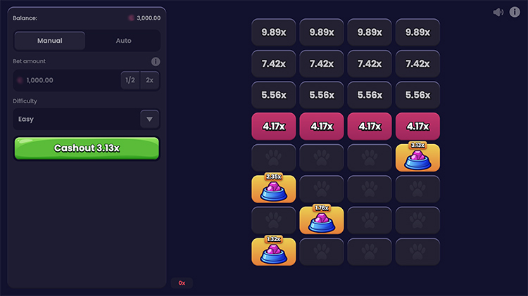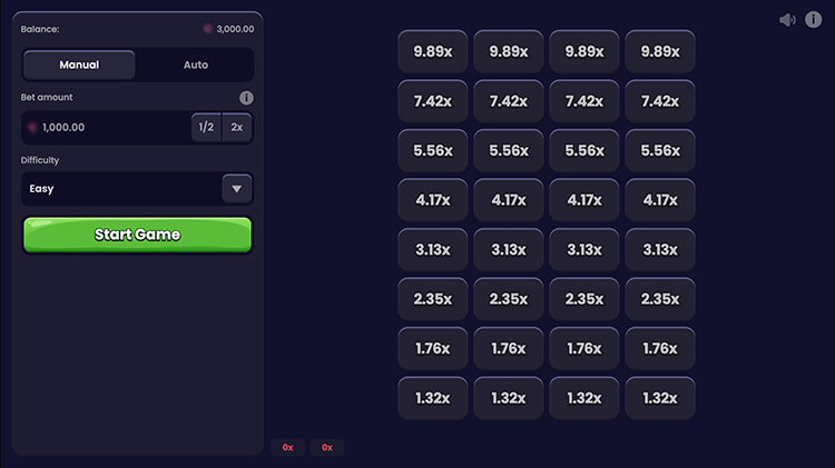 На экране отображаются ячейки со случайными коэффициентами. Когда пользователь начинает игру, активируется первый ряд. Необходимо выбрать одну из отмеченных клеток: если в ней выпадают драгоценные камни, можно забрать выплату или перейти к следующему раунду. Провайдер добавил несколько режимов сложности:
